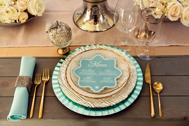 Complimentary charger plates alongside matching napkins and gold dainty cutlery.