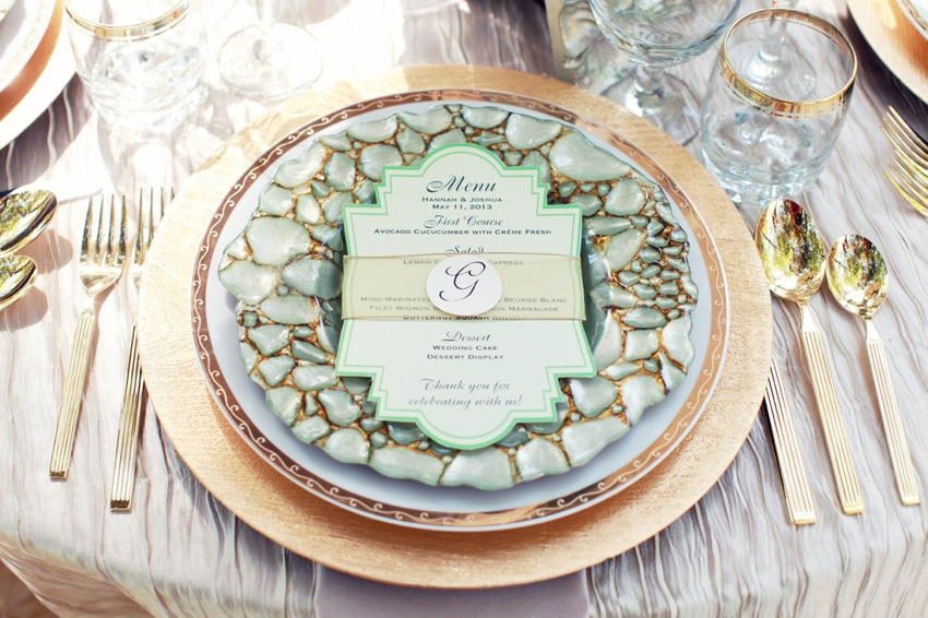 Gold rimmed glasses and uniquely decorated dinner plates create this gorgeous summer look.